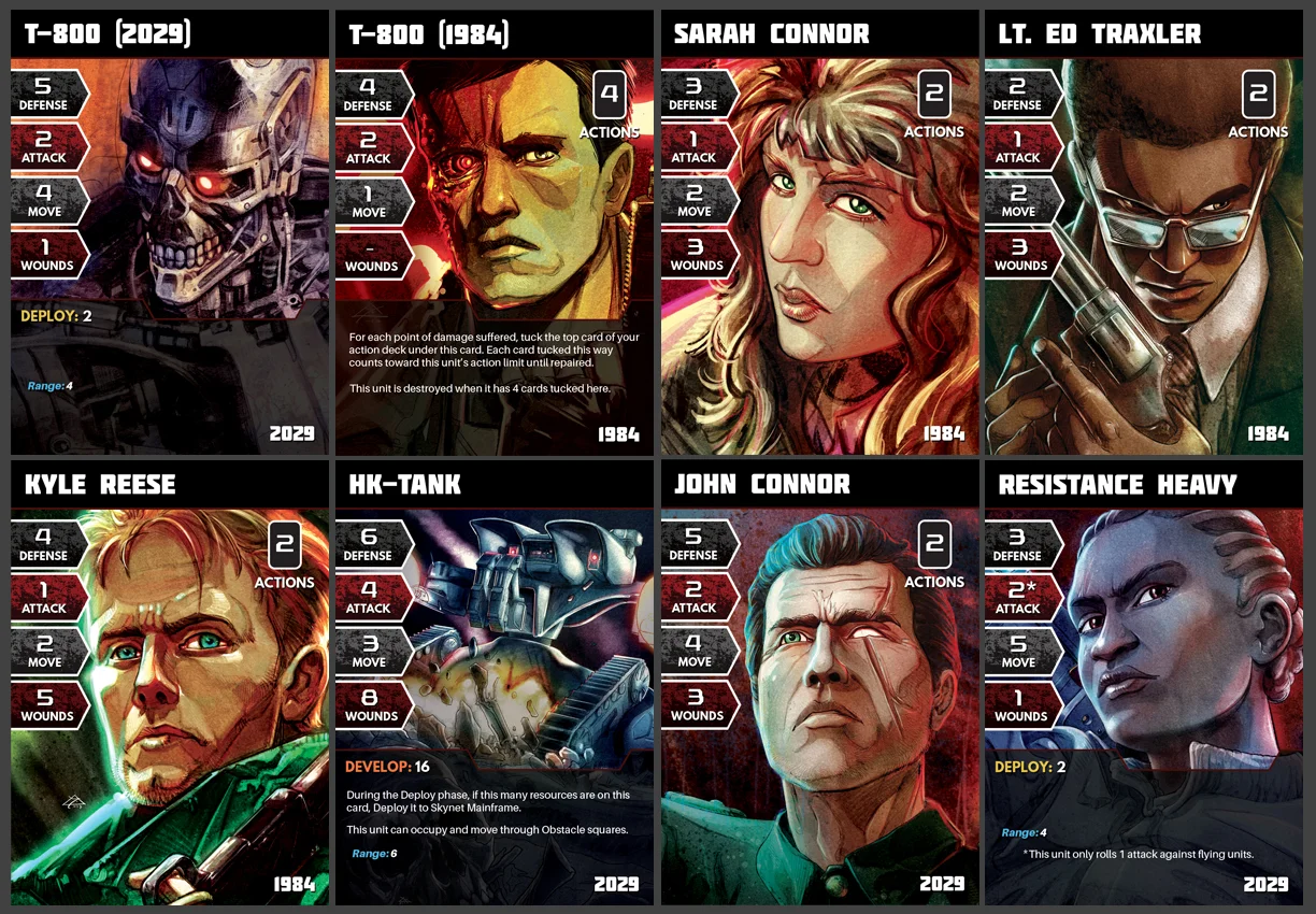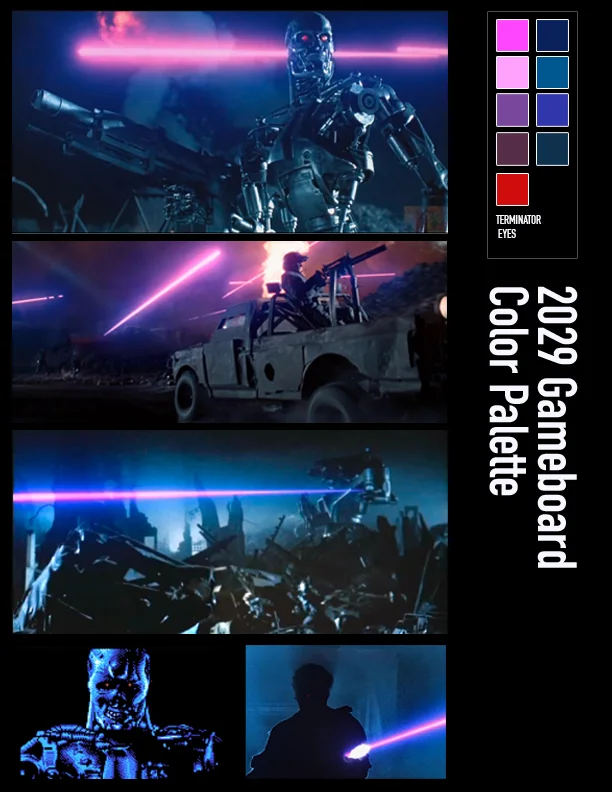 The Terminator was a very moody film as far as color. Since there are two time periods to consider (1984 and 2029) I had to keep that in mind for cards or game board areas that pertained specifically to those backdrops. Illustrators had to limit there color palettes often where applicable.