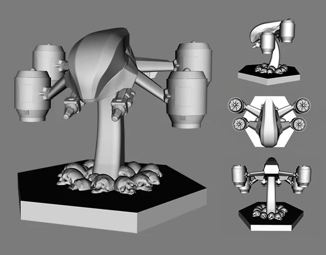 The game required a new vehicle alongside the HK-Aerial and HK-Tank. The general idea was to create a much smaller drone aerial device that Skynet could send out in swarms (no bigger than a soccer ball but very deadly). I created several pages of mood boards with details and height requirements for the game piece and then handed off to the 3D modeling team. Once approved, the HK Stinger was illustrated onto a stat card.